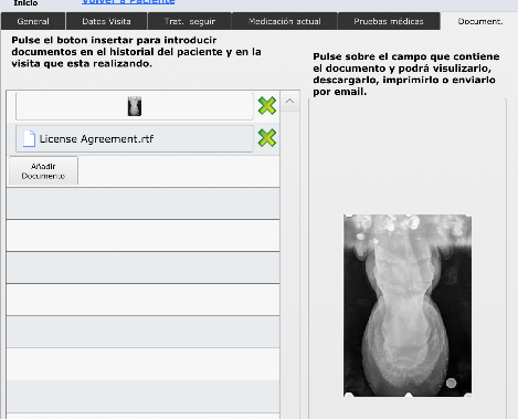 La ficha de pacientes incluye un completo gestor de documentos en el puede añadir documentos en formato, PDF, word, Excel,text, etc, imágenes en cualquier formato, vídeos, etc, incluso puede realizar fotos o vídeos directamente desde el iPad y añadirlos de forma automática en la ficha del cliente.
