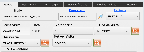 En esta primera pestaña están todos los datos personales del paciente y el propietario y datos del registro rápido de la visita como Tipo de visita, asistencia, motivo de la visita, comentario de la visita.