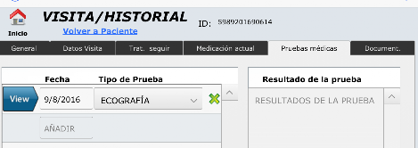 Gracias a esta pestaña podrá registrar las pruebas realizadas al paciente y registrar y controlar los respaldados de las mismas, registrando la fecha o cualquier dato relevante de la misma.