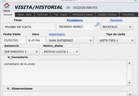En el panel de visitas dispone de datos importantes relacionados con esa visita con los datos de Propietario y paciente, fecha y hora de la visita, tipo de visita y motivo de la misma, comentarios generales de la visita, observaciones, etc.